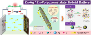 Recently, Junwei Zhao group published a new paper in Energy Storage Materials, the title is “Stable aqueous Zn−Ag and Zn−polyoxometalate hybrid battery driven by successive Ag+ cation and polyoxoanion redox reactions”. In this paper, the authorsuggeststhatHybrid batteries with multiple electrochemical reactions that integrate respective advantages and remedy intricate shortages of disparate batteries are both fundamentally interesting and practically attractive. Here, an aqueous hybrid battery combining electrochemical features of Zn−Ag battery and Zn−POM battery is for the first time proposed, which is actuated by successive Ag+cation and polyoxoanion redox reactions in an insoluble polyoxometalate (POM)-based cathode. The unique POM-based composite material constructed from loose stacking high-nuclearity polyoxovanadate clusters and crystalline Ag nanoparticles not only provides plentiful Zn2+storage sites but also presents fast ion / electron diffusion kinetics. Meanwhile, both the severe migration of Ag+ions and the dissolution of POM clusters in aqueous electrolyte are effectively inhibited. The as-fabricated hybrid battery with POM-based cathode exhibits a reversible capacity of 200 mAh g–1at 10 A g–1with outstanding capacity retention (97.4% over 7000 cycles) and superior rate capability. Moreover, the stable hybrid energy storage mechanism is revealed in detail. The work presents a promising strategy for the application of POM-based electrode in aqueous batteries and provides heuristic thinking for further developing novel energy storage systems.