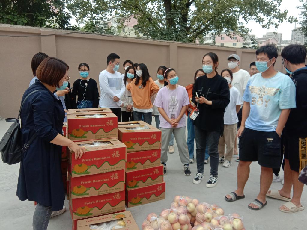 高度重视学生生活需求,牵挂学生身心状态,为凝聚力量、共同防疫、温暖人心、传递关爱,9月27日下午,学院党委办公室主任、2022级辅导员宁攀,团委书记、2020级辅导员郭佳代表学院为被临时封控在北苑和东苑学生公寓的学生发放了爱心水果。