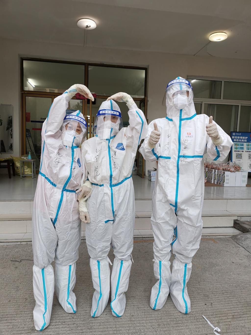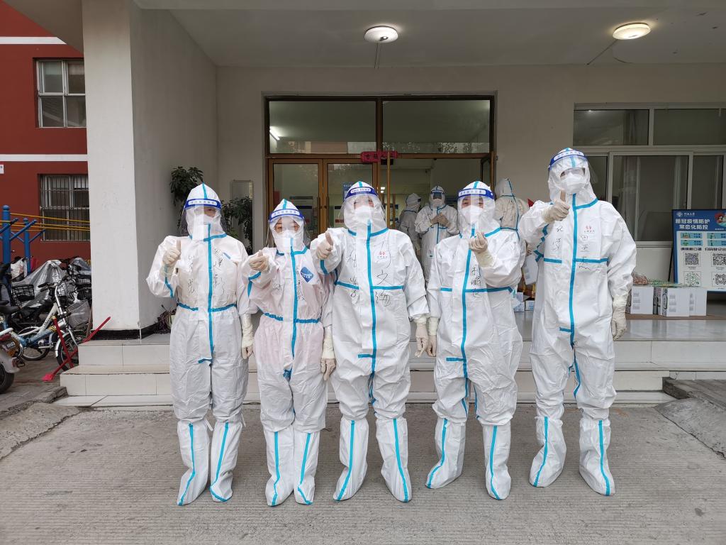 疫情突然加重时,学院不少老师报名了学校的抗疫志愿者,但考虑到老师们的实际情况,最终田亚杰、聂亚敏、刘建彩、徐浩、于欣等几位青年教师加入金明校区内外宿舍园区的抗疫志愿服务队,每天奋战在疫情第一线。他们穿着厚厚的防护服在公寓楼层间协调全员核酸检测;他们化身“飞人”,穿梭于各楼层之间,只为让同学们按时吃上热乎的饭菜;他们舍小家顾大家、团结一致、坚守岗位,共抗疫情!
