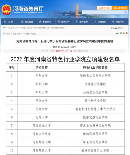 近日,河南省教育厅等十五部门公布了《关于省级特色行业学院立项建设单位的通知》(豫教高〔2022〕122号),我校碳中和行业学院正式获批立项为省级特色行业学院。