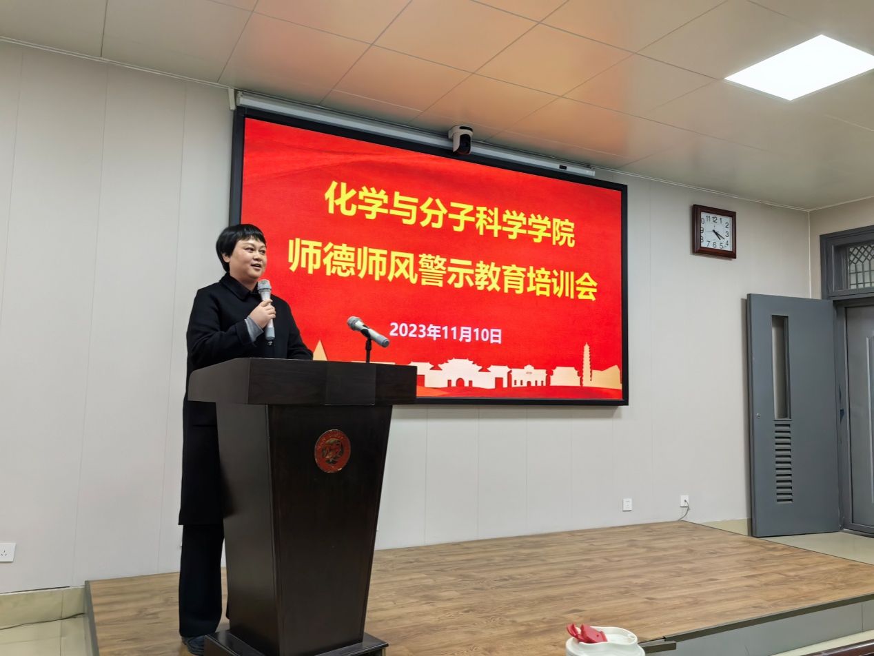 教职工师德师风负面清单自查表》内容,一日三省,保持警钟长鸣。通过本次师德师风警示教育培训会,要学有所得,真正起到思想铸魂、固本强基、以案促学、师德引领的作用。常凤香强调,在学校“双一流”“双航母”战略叠加的黄金时期,在学院上下齐心协力,踔厉奋发,争创“一流”的关键阶段,全院教师要进一步提高政治站位,牢记为党育人、为国育才的初心使命,认真履行好教师的神圣职责和时代赋予的重任,为学校“双一流”“双航母”建设奉献化学人蓬勃力量。