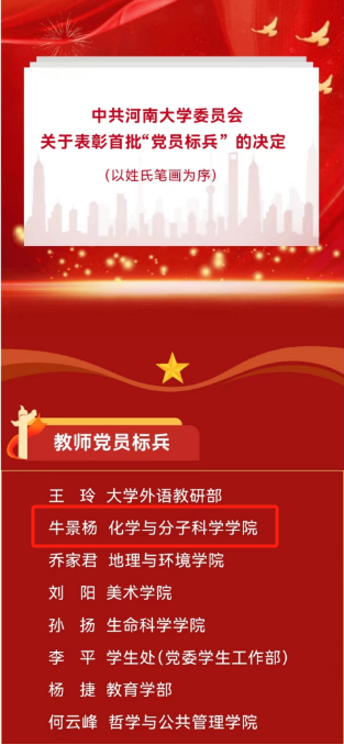 作为一名高校党员教师,牛景杨教授始终坚持党建引领,自觉运用习近平新时代中国特色社会主义思想改造主观世界,不断增进对党的创新理论的政治认同、思想认同、理论认同、情感认同,做到了潜心问道和关注社会相统一、学术自由和学术规范相统一,实现了理论学习系统化、经常化。从事多酸化学研究,在该领域开展了多方面的探索,推动了多酸化学的发展。先后主持完成各类项目30余项,其中国家级项目11项;发表研究论文500余篇,出版著作2部,获河南省科技进步二、三等奖各1项。培养硕士研究生75人,博士研究生10人。先后被评为河南省跨世纪学术技术带头人、河南省中青年骨干教师、河南省优秀专家、河南省特聘教授、享受国务院特殊津贴专家、中原千人-基础研究领军人才、河南省高层次人才(B类)。