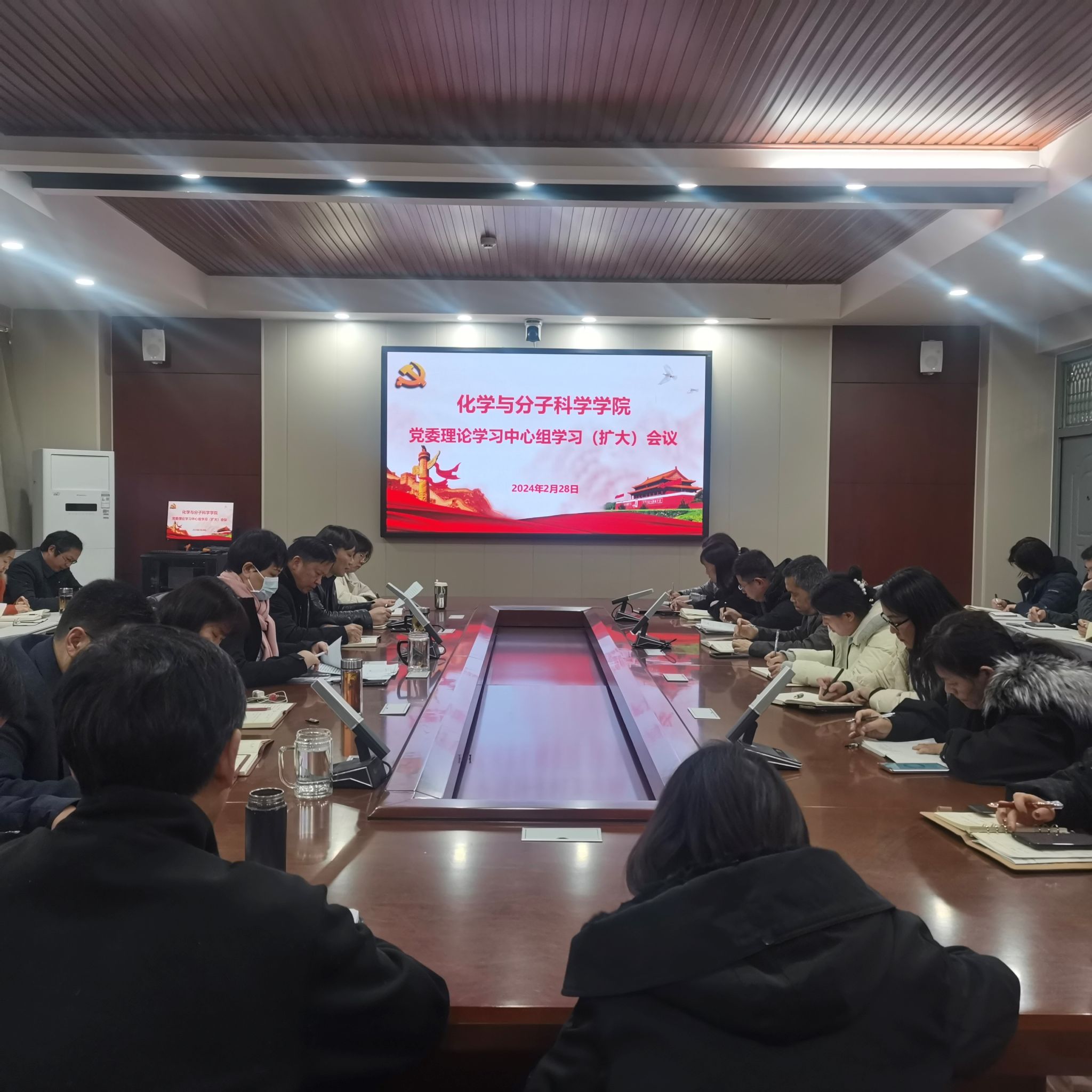在学院220会议室召开党委理论学习中心组学习(扩大)会议,学院全体党委委员、组织员、支部书记、系室主任、高层次人才代表和学生党员干部代表等三十余人参加会议,会议由学院党委副书记马文海主持。