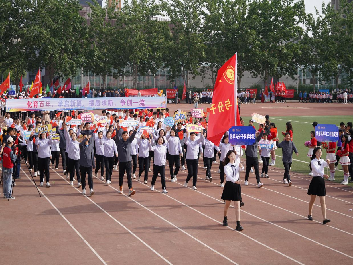 方阵以党委书记常凤香为领队,教职工们身着统一的服装,手中挥舞着红色国旗,举着“化育万物,学无止境”“争创世界一流”“Sports 加油”“秀出风格,赛出水平”等各类标语,精神抖擞。同学们身穿印有化学结构式的白色短袖,组成的方阵秩序井然,他们迈着整齐划一的步伐,举着醒目的旗帜——“化育百年,承启新篇,提质求新,争创一流”,体现了色中色