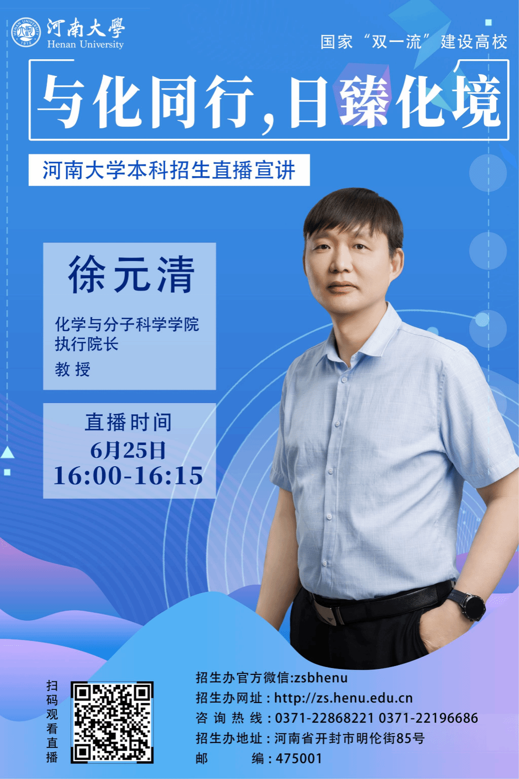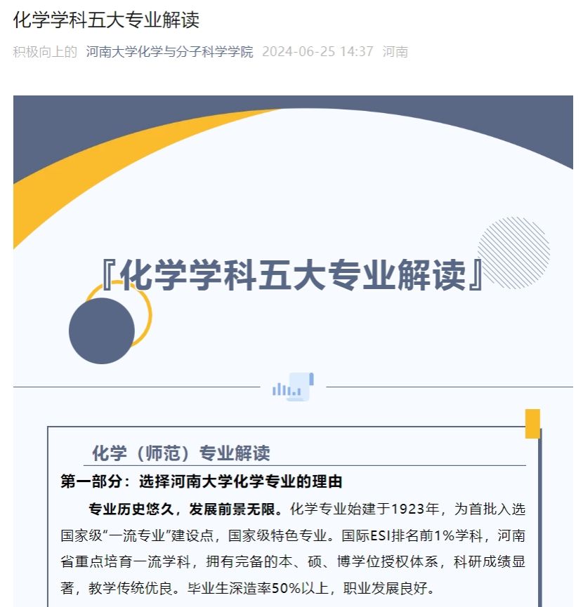 在做好面对面招生宣讲的同时,学院还通过多种形式和渠道,向潜在的学生、家长以及社会公众展示学校的办学理念、教育质量、专业特色、学科优势等,从而吸引更多优秀的学生报考。执行院长徐元清参加学校招办组织的院长说专业线上直播,胡卫平教授、付记亚教授作为宣讲专家参加了学校招生线上直播。2023级本科生王舒心录制了《学姐说专业》招生宣传视频。在学院官方网站开辟招生宣传专栏,介绍学校和学院招生政策,学院微信公众号及时推出专业介绍和招生计划等信息,尤其是对我校化学等专业2024年新增本博贯通“菁英博士”实验班进行重点宣传。开通招生咨询电话,报考期间每天安排专人负责接听,线上线下相结合,大力推动招生宣传工作。