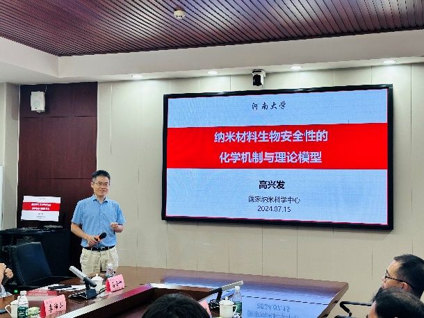 高兴发的报告题目为“纳米材料生物安全性的化学机制和理论模型”。报告中,他重点介绍了其课题组近期在纳米材料生物安全性方面的研究进展。主要内容包括:聚焦“纳米表面活性氧反应机制与规律”关键科学问题,进行了“机制-模型-验证”递进式研究。对真实纳米颗粒采用理想表面、理想颗粒近似,在研究共性反应机制基础上,运用表面催化和电子能带原理建立机制驱动模型,为模型发展计算机辅助方法进行模型验证与应用,验证了机制驱动模型及理论指导实验纳米毒理学研究新范式。