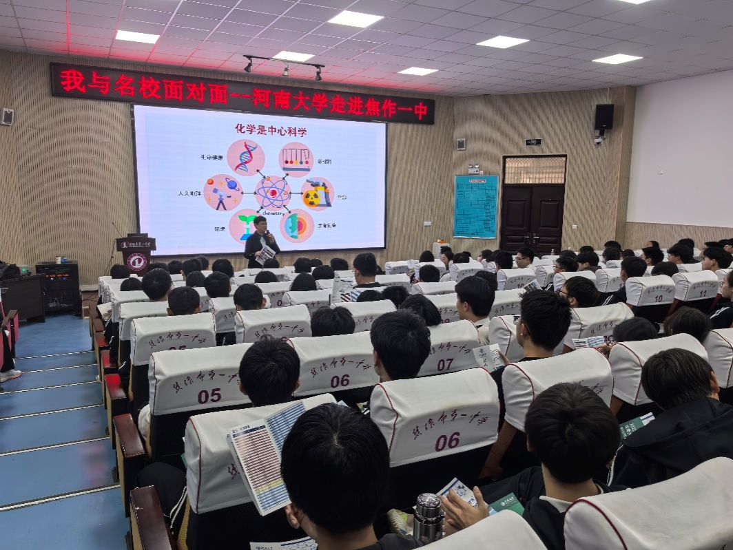 党委书记常凤香、院长陈永明等一行三人应邀赴焦作一中开展科普讲座和招生宣传等交流活动,焦作一中校长王强、学生发展中心主任李志新、化学组田永刚等近200名师生参与了交流。