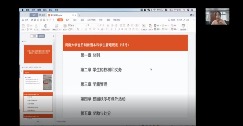 14日下午,21级辅导员董洁为新生展开校规校纪教育,分别从学生的权利和义务、学籍管理、校园秩序与课外活动、奖励与处分四个方面进行讲解。董洁告诉新生在校应注意的事项,如努力提升自己不要挂科、评优评先的条件以及违纪的惩罚措施。董洁用自己的亲身经历劝告新生们只要好好学习,未来有无限的可能。