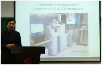 安德鲁博士,首先介绍了一维气相色谱的各组成部件,包括注射器,色谱柱和探测器以及探测器的分离特点。重点介绍了二维气相色谱的基本原理及其在分析复杂有机体系中的应用 ,二维气相色谱的产生背景及优势,一维气相色谱与二维气相色谱的差异。安德鲁博士还用幽默诙谐的例子讲述了切心技术(Heart-Cutting GC)在我们生活中的应用,并且证明了切心技术的普适性。安德鲁博士的精彩报告赢得了大家的阵阵掌声。报告结束后,安德鲁博士与师生们进行了深入热烈的交流讨论,与会师生受益匪浅。此次报告会拓宽了与会师生对气相色谱的了解,使师生们对气相色谱的了解由一维上升到了二维,对复杂体系的分离也有了进一步的了解。
