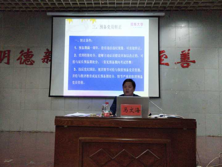 马文海为在座同学讲解党员的发展程序,他首先结合过去的工作经验,用幽默的语言教导同学们要在生活中更好地与他人交流。接着他从“入党积极分子的确定”、“发展为预备党员”、“转为正式党员”三个方面详细介绍了成为党员的各个步骤,为同学们解答了党员培养中出现的问题。同时,在报告会中,马文海指出同学们要端正思想态度,杜绝弄虚作假行为,以“全心全意为人民服务”为宗旨,不断深化自我,提高思想觉悟。