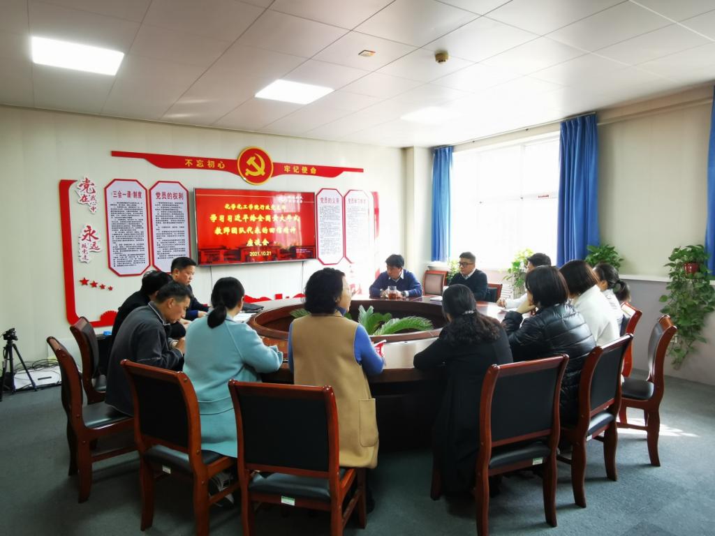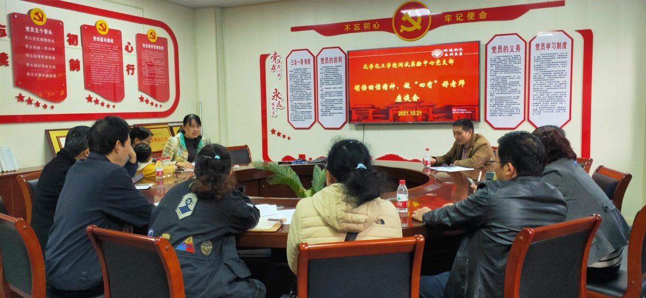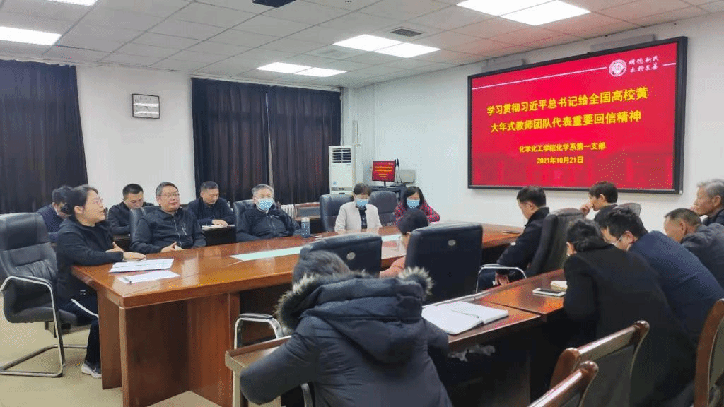 学习贯彻习近平总书记给全国高校黄大年式教师团队代表重要回信精神实施方案》文件要求,10月21日,化学化工学院各教工支部分别开展以“领悟回信精神 做“四有”好老师”为主题的座谈会,座谈会由各支部书记主持,支部全体教师参加座谈。