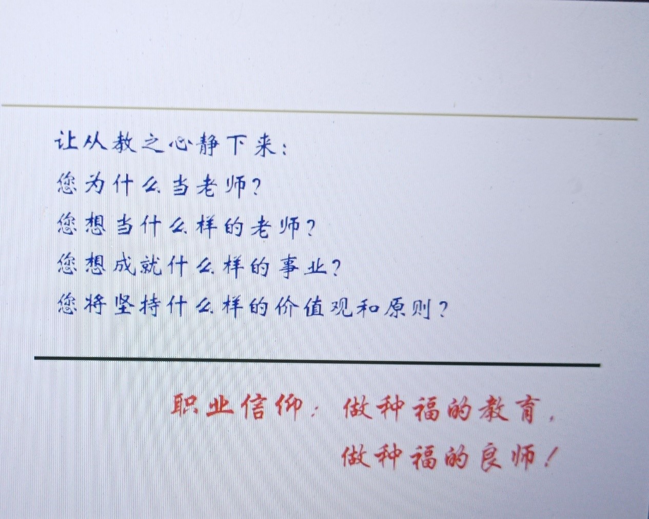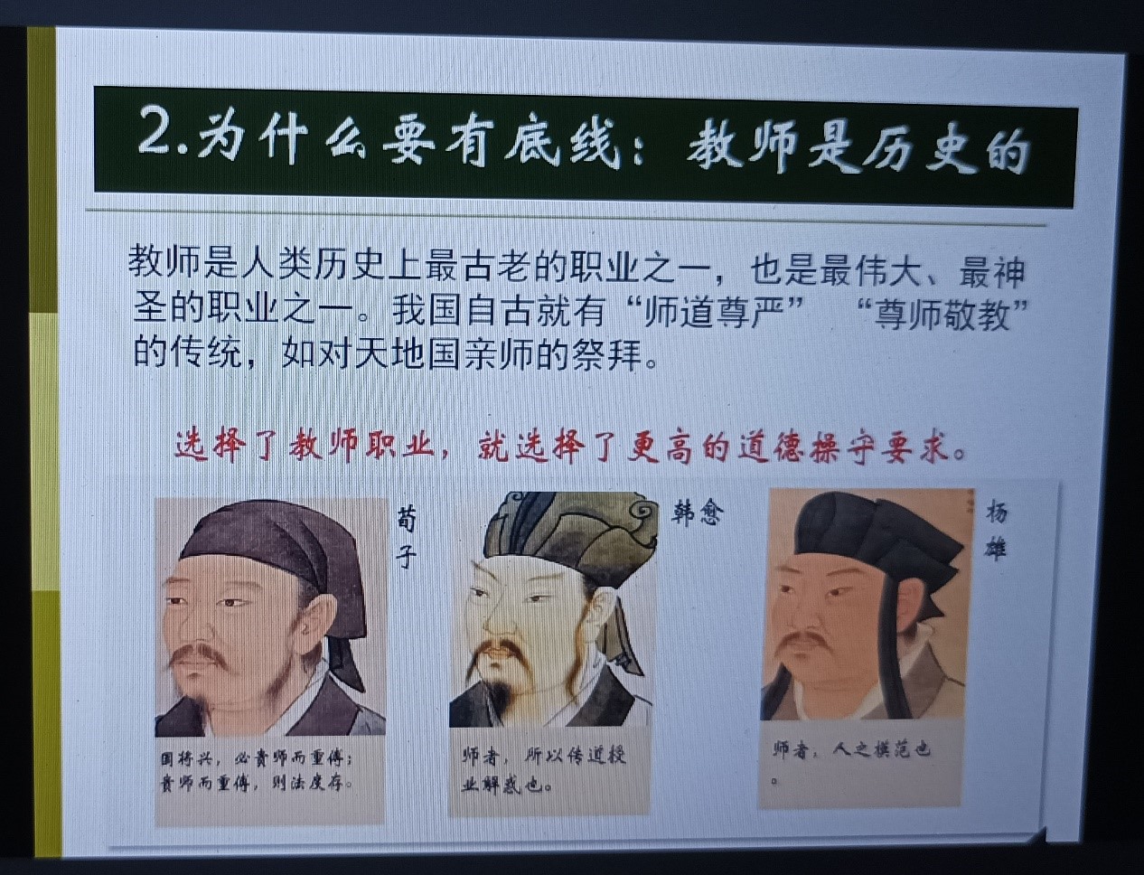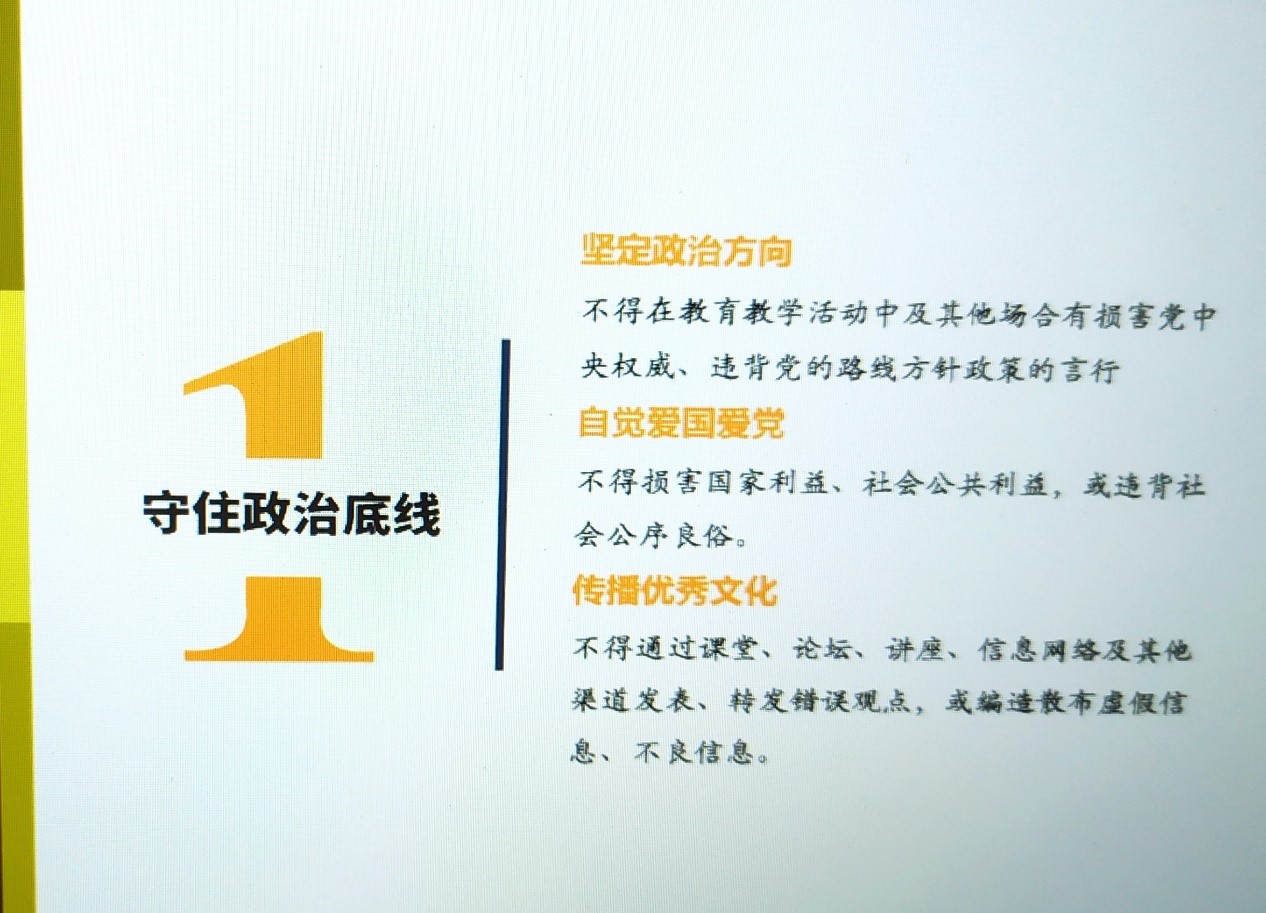 其次立足教师底线,从守住政治、法律、纪律政策、道德底线四方面简述教师底线内容;从历史、现实及未来三方面阐述教师必须要有底线的原因。对于选择了教师职业的同学们,要建立更高的道德操守要求,以德育德,以爱传爱,以行导行。
