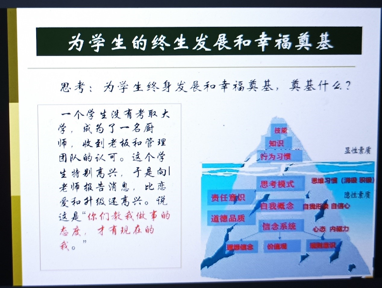 王晓菲从培养拥有幸福感的师德修养出发,结合身边的事例进行讲述。首先嘱咐同学们关注师德修养,培养关怀、宽容、良知、责任等良好品质。做到既给他人幸福,也让自己幸福。在教育生活中努力追求“四好”教师,即身心健康、工作出色、家庭美满、生活幸福。