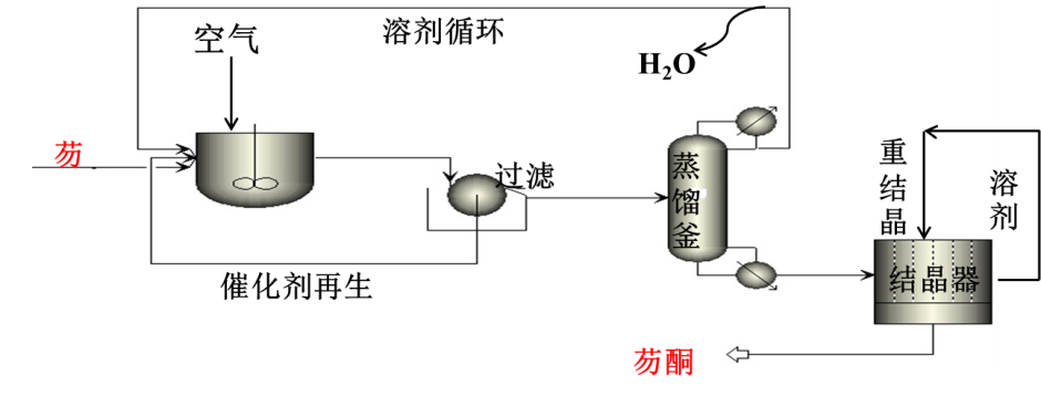 目前,固定床反应器上芴高温气相氧化制备芴酮过程,存在芴易被过度氧化,副产物多且催化剂寿命低等难题。而传统液相氧化法制备芴酮需要在碱性条件下,借助相转移催化剂才能实现芴的高效转化,但该过程增加了产物后期分离、提纯的难度,同时存在均相催化剂分离、回收困难等难题。