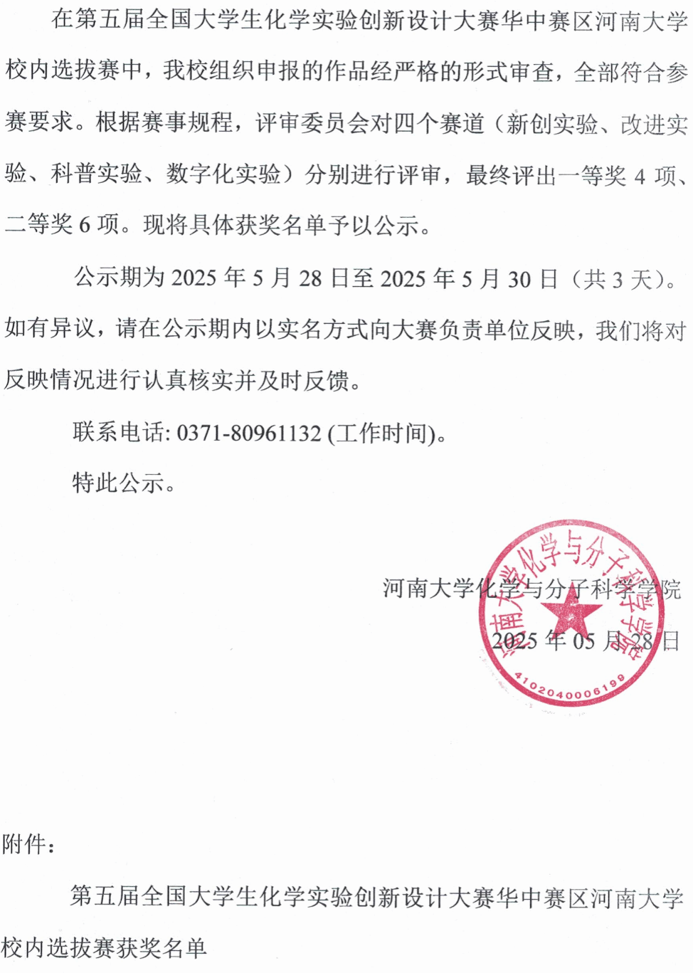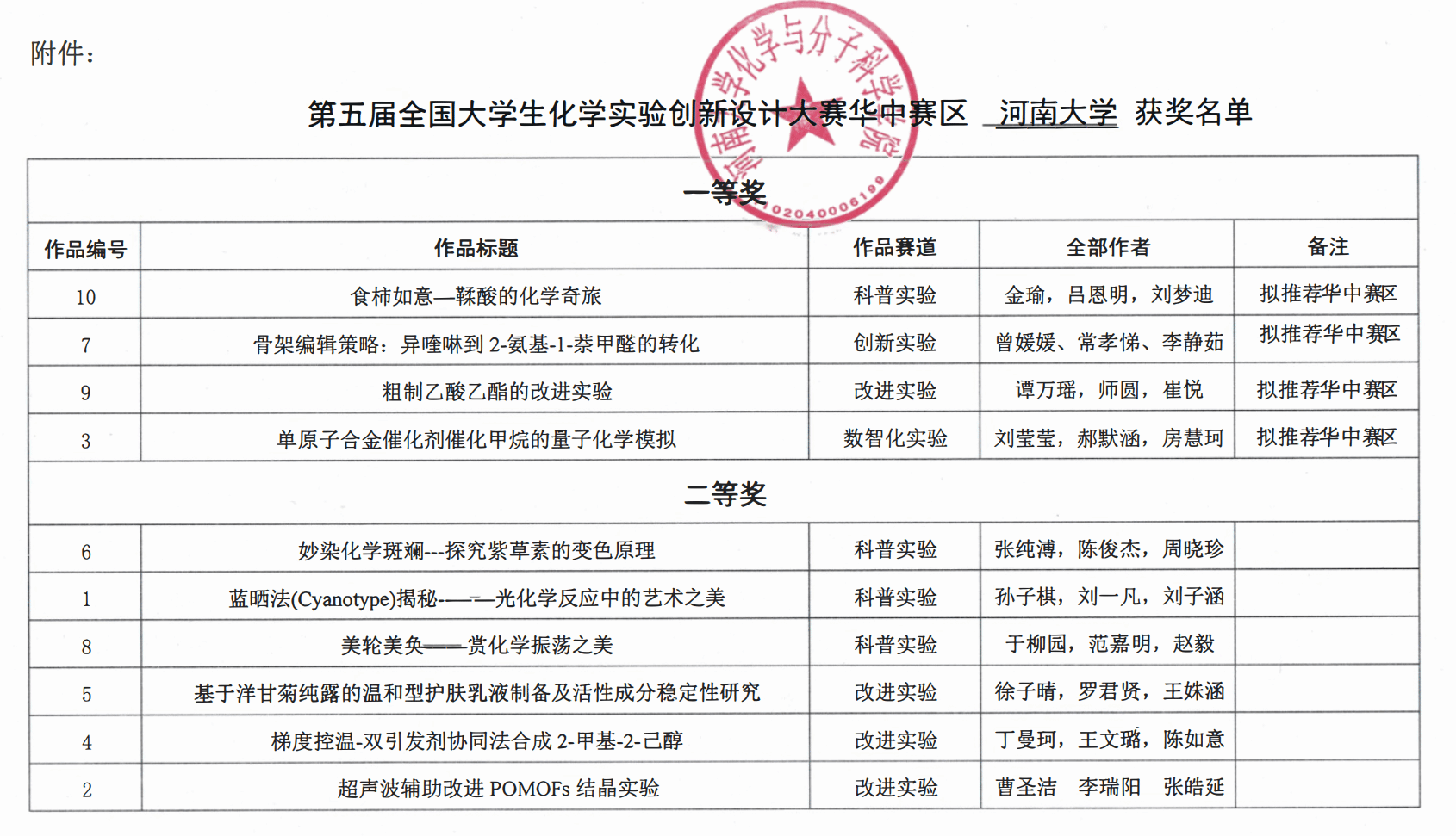 第五届全国大学生化学实验创新设计大赛华中赛区色中色 校内选拔赛获奖名单公示
