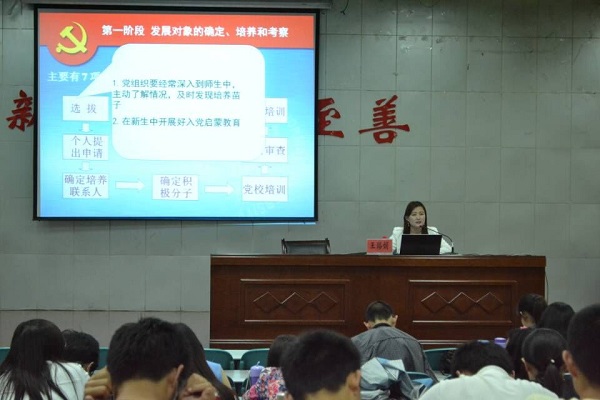 2015年近200余名入党积极分子进行2015年春季党课培训班第三次培训,主讲题目为“入党动机与党员发展程序”。