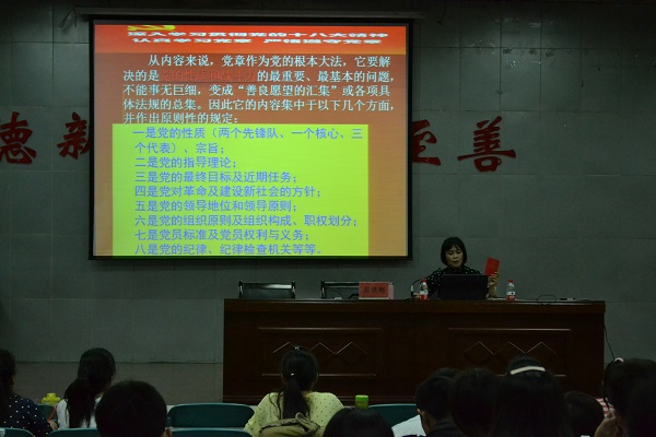 张秋梅以“党的章程”为出发点,结合自己多年的组织发展工作经验,深入浅出的解读了党章的地位、作用和意义。并提出了组织对党员的要求,为今后成为一名合格的共产党员明确了方向。她结合学院学子在2014年秋、春季运动会、大学生挑战杯、校园之星评选中取的成绩,以及2015年考研率、色中色