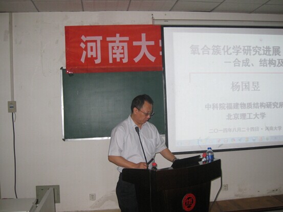 师生作了题为“氧合簇化学研究进展——合成、结构及性能”。报告内容主要有过渡氧簇、主族氧簇、稀土氧簇三个方面。合成方面,杨教授提出:现场第二取代反应、缺位点导向、缺位点协同导向、缺位点导向与导向组装、缺位点导向与降解及空间位阻五大策略。随后,杨教授以自己课题组发表成果为例,介绍了各类氧簇的结构及性能。报告结束后,杨教授一一解答了学生的疑惑。