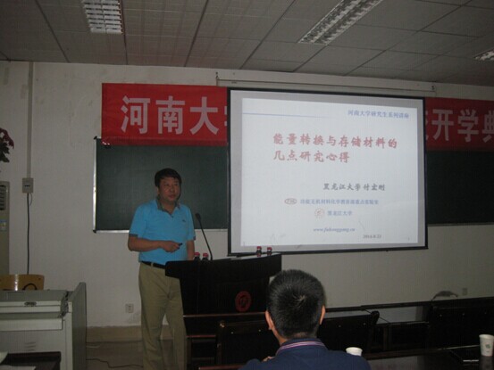 付宏刚教授主要讲述以下内容:第一,能量转换与存储材料。第二,新型能量存储和器件。主要讲述硅基太阳能电池、染料敏化太阳能电池、超级电容器等器件的工作原理和相关已报道论文。第三,关于材料研究的几点心得。付教授主要结合自己课题组已申请的专利和已发表的论文讲解了纳米片层碳的剥离与组装及电化学应用和提高纳米半导体光催化性能的表面界面调控策略。
