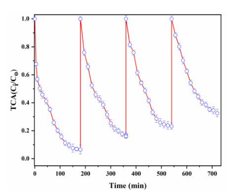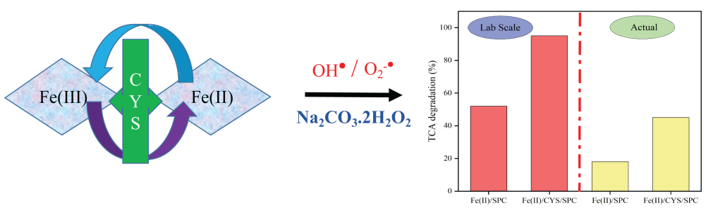 卤代烃被广泛用于精密机械、汽车、电子、纺织、制药、化工等行业,如1,1-三氯乙烷(1,1-TCA)、三氯乙烯(TCE)、、四氯化碳(CT)等。其中TCA是卤代烃化合物的主要代表,也是地下水有机污染的主要来源之一。原位高级氧化是采用特殊氧化体系直达地下水污染区域,进行低成本精准修复的一类方法。课题组通过将Fe(II)/CYS/SPC高级氧化体系用于水体TCA污染的修复工作取得了一系列重要成果,梳理了CYS、Fe(Ⅱ)和SPC在反应体系中的主要作用,分析了羟自由基与超氧化物自由基的发生机理,对体系的复用性和稳定性进行了验证,经四次循环后TCA降解率仍能达到68%,Fe(II)/CYS/SPC高级氧化体系可以作为地下水TCA污染修复的有效途径。