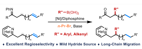 最近,他们在前期镍催化硝基芳烃还原二烷基化(Org. Chem. Front. 2022, 9, 4875)和烯烃二硼化(Chem. Commun. 2022, 58, 10709)工作基础上,利用商业可得二膦镍催化体系,发展了烯基远程迁移实现酮和吡啶β-芳基化和烯基化新策略,相关工作发表在国际著名期刊Angew. Chem. Int. Ed. 2023, DOI: 10.1002/anie.202313336.