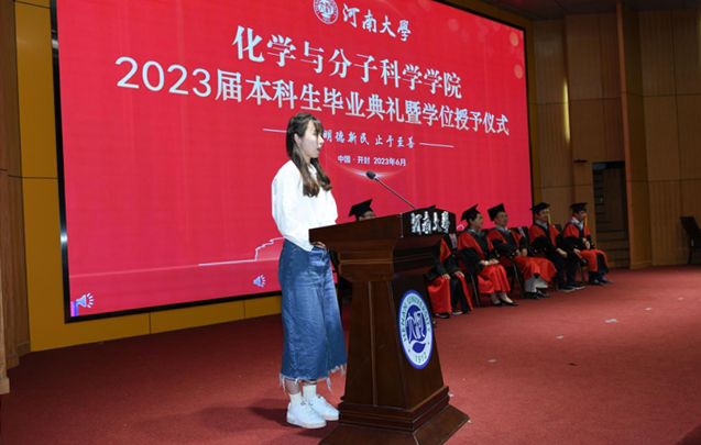 2020级化学专业的付李铭代表在校生发言。她回忆了与学长学姐们相处的时光以及学长学姐们曾经给予的帮助,代表学院在校本科生对全体毕业生表达了感谢并寄予真挚的祝福,并表示将会接过学长学姐们手中的火炬,继续为色中色