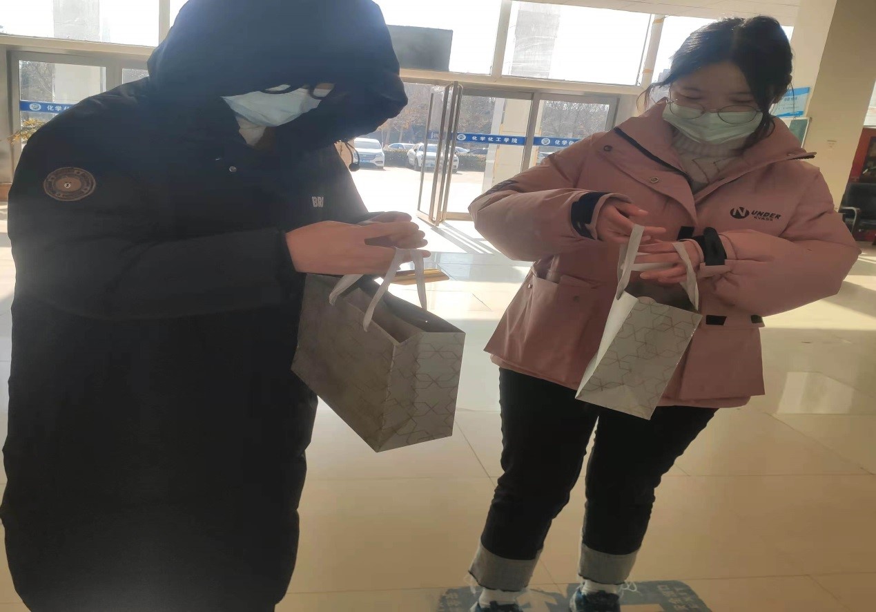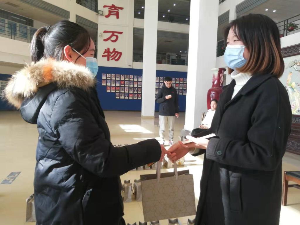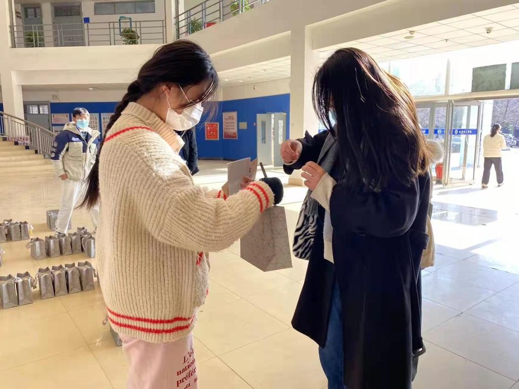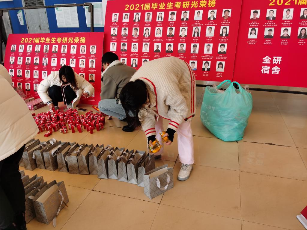 为今年准备参加研究生考试的2018级180多名同学准备的“考研爱心大礼包”,希望可以用这种特别的方式给考研学子们传达最暖心的祝福以及最诚挚的祝愿。大礼包的礼品袋上有个金牌,寓意金榜题名,里面装有温馨提醒卡,温馨提醒卡的背面是学院领导给考研学生的温情祝福。大礼包里还有旺仔牛奶、巧克力、棒棒糖、小面包等一些小零食、一包纸巾和一张写满祝福的明信片。学院党委副书记马文海、副院长张磊带领本科生辅导员们现场给考研学子们加油打气、送上暖心祝福。