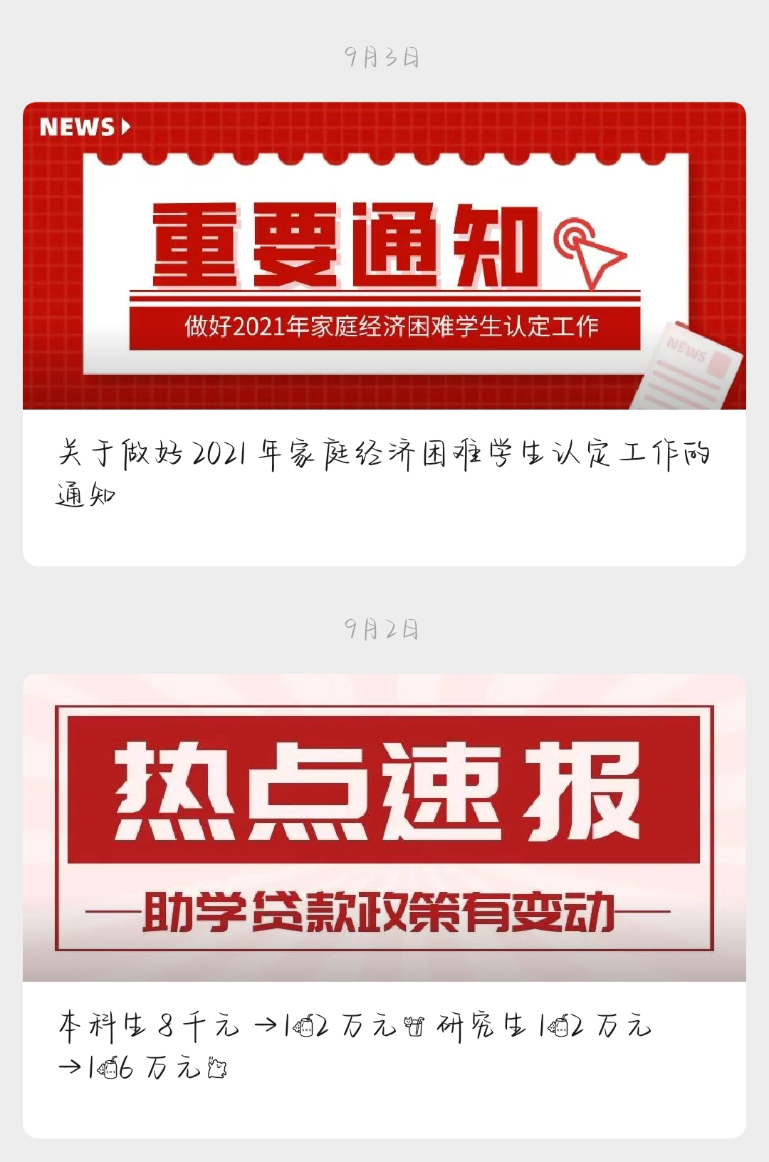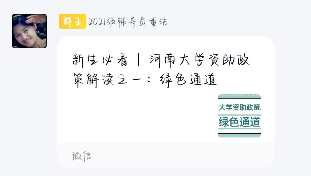 开展多渠道、多层次、多方位资助政策宣传。微信公众号围绕资助政策、防骗指南等内容进行推文;21级辅导员董洁在班级群里积极宣传“绿色通道”、“助学贷款”等资助政策;资助服务站的队员们满怀热情为21级新生提供在线政策咨询,帮助他们克服困难,减轻负担。