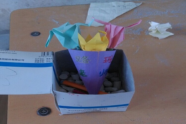 每次一下课,孩子们都会把老师围得水泄不通,久久不想散开。他们只是想再多了解一点外面的世界,再多听听老师的声音,再多看看他们喜爱的老师。“路老师,这是我做的百合花,送给你。谢谢你给我们上体育课,带领我们做游戏,教我们唱歌,我好开心!老师,你辛苦了!”一年级学生田程程手捧着花,奶声奶气地对着志愿者路瑶说道。接过承载着真诚感谢的百合花,路瑶激动得不能自已。