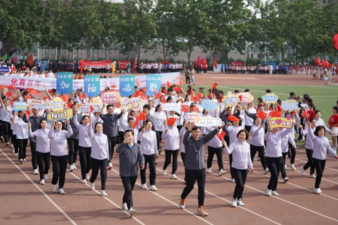 方阵以党委书记常凤香为领队,教职工们身着统一的服装,手中挥舞着红色国旗,举着“化育万物,学无止境”“争创世界一流”“Sports 加油”“秀出风格,赛出水平”等各类标语,精神抖擞。同学们身穿印有化学结构式的白色短袖,组成的方阵秩序井然,他们迈着整齐划一的步伐,举着醒目的旗帜——“化育百年,承启新篇,提质求新,争创一流”,体现了色中色