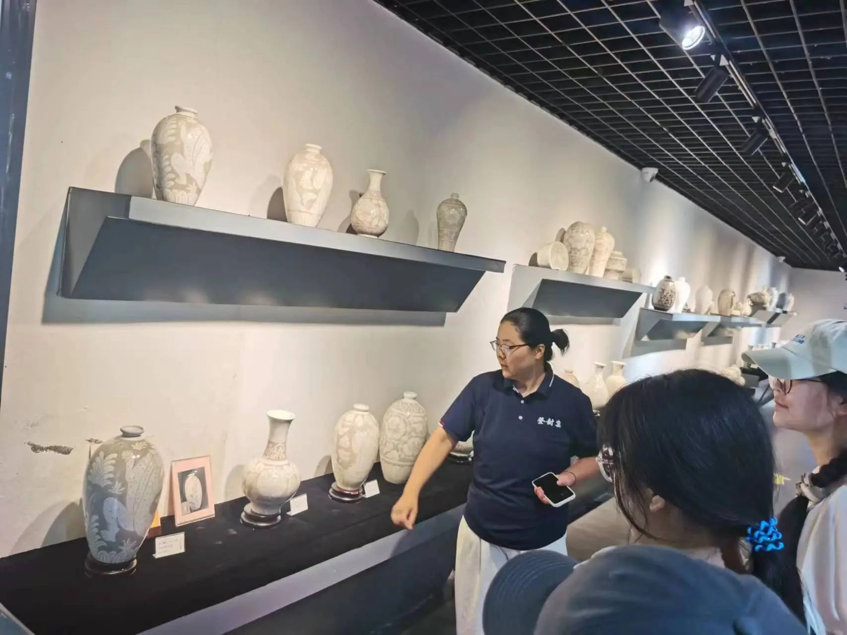 团队前往登封窑复兴基地,在讲解员的带领下,我们首先参观了销售展览馆。在讲解员的细致讲授下,成员们了解到“登封窑”是中原地区民窑系最具代表性的窑口之一,出现有黑瓷、白瓷、黄瓷、花瓷等。其中,白瓷中的珍珠地这一技艺深深的吸引成员们的眼球,使成员们对瓷器有了全新的认知。同时成员了解到是现任传承人李景洲李老先生使失传达千年之久的登封窑历史名瓷白釉珍珠地划花得以恢复,这种传承不守旧,创新不忘本的精神深深地感染着我们,使成员们对推动优秀传统文化创造性转化和创新性发展有了更深一步的认识。