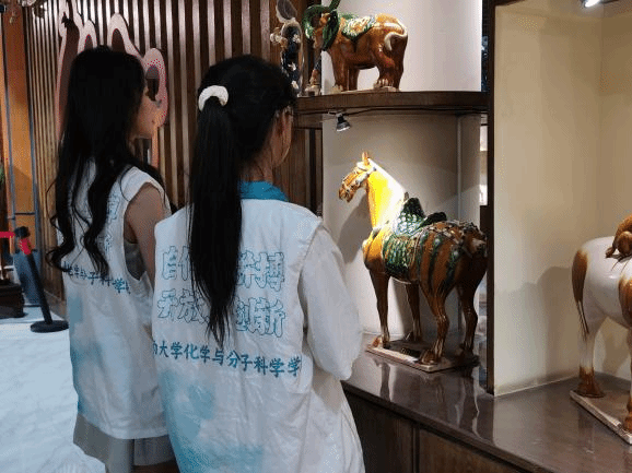 团队怀着对传统文化与科学奥秘的双重探索热情,走进洛阳唐三彩博物馆,开启了一场将化学知识与历史文化深度交融的三下乡之旅。展厅里,大家驻足于唐代三彩马俑前,仔细观察其绚丽多彩的釉色。结合所学,同学们讨论起釉色形成的化学原理,同时通过馆内相关知识讲解,同学们了解到了唐三彩悠久的历史及较为详细的制作流程。