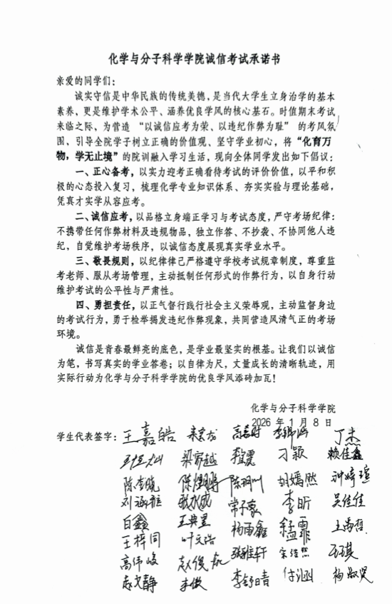 以诚执笔,方绘锦绣答卷;以信立身,方行坦荡前路。此次本科各年级诚信考试动员暨安全教育大会的开展,让安全与诚信理念深植每一位化院学子心中,筑牢了考风考纪防线。愿全体同学带着诚信坚守与师长嘱托,以清朗考风护航学业成长,以真才实学书写青春华章,用诚信品格与扎实学识,绘就属于自己的精彩青春答卷!