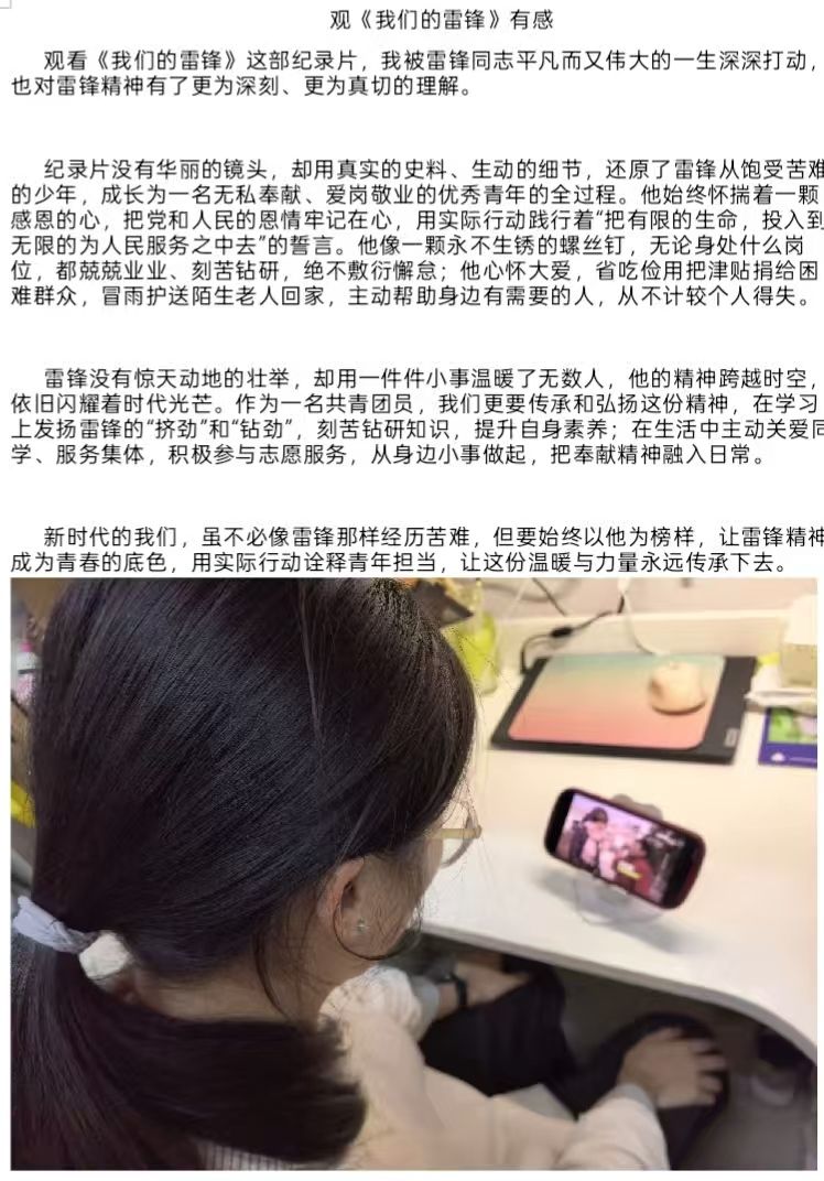 春风送暖,志愿正红。 2025级化学第二团支部积极组织本次雷锋月活动。一部分团员带头整理学院自习室、规范停车秩序,用汗水擦亮校园底色;其余团员通过观看雷锋纪录片、撰写心得感悟 ,在光影中汲取榜样力量。