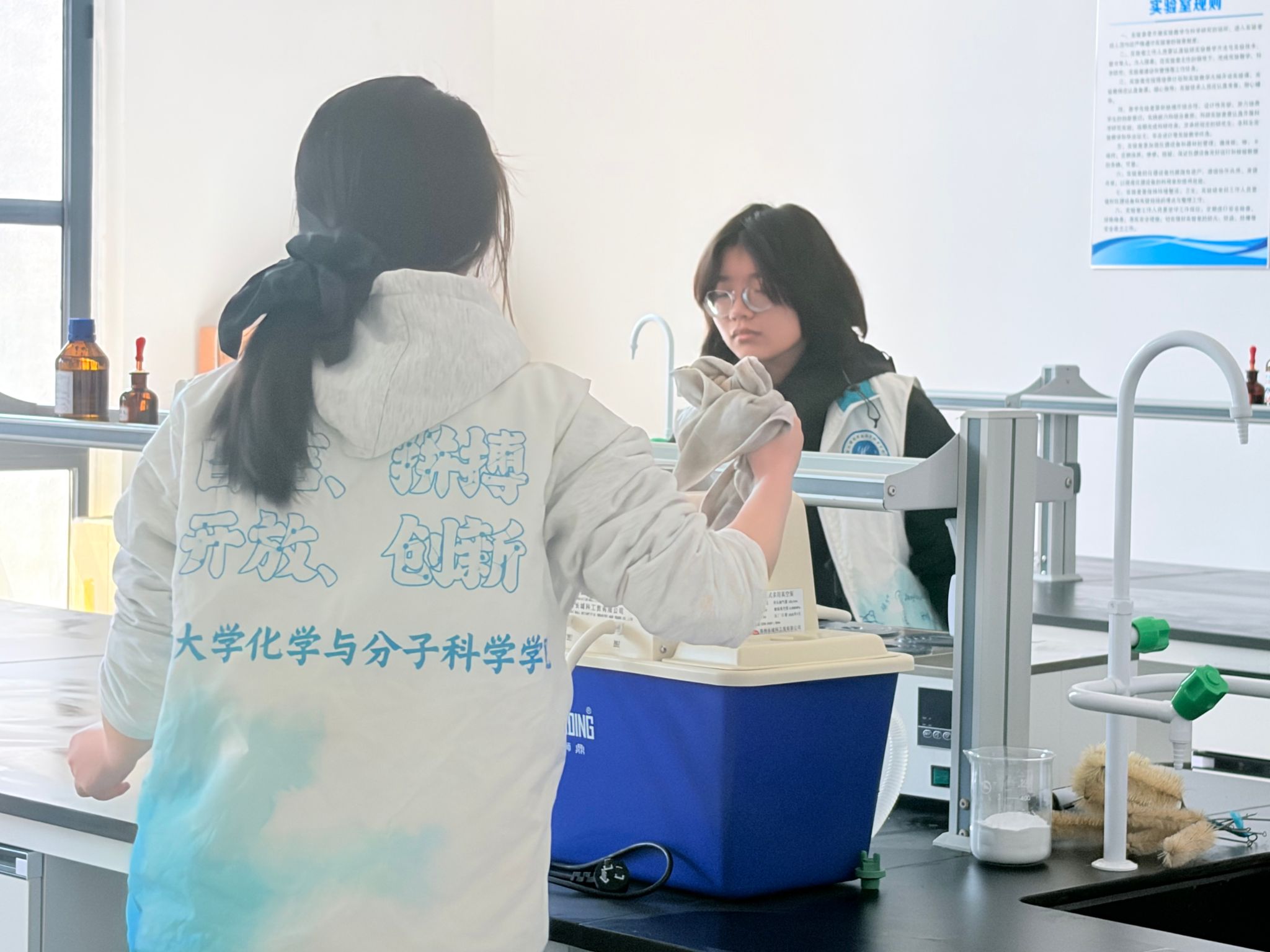 为弘扬雷锋精神,响应学院“学雷锋志愿服务月”号召,3月20日中午,2025级化学第一团支部组织15名团员代表走进科创西楼一楼化学实验室开展志愿打扫活动。同学们分工协作认真细致清理实验台面、整理器材、清扫死角,用实际行动美化校园环境。此次活动不仅践行了奉献精神,更展现了青年团员的责任与担当,让雷锋精神在实践中焕发新光彩。