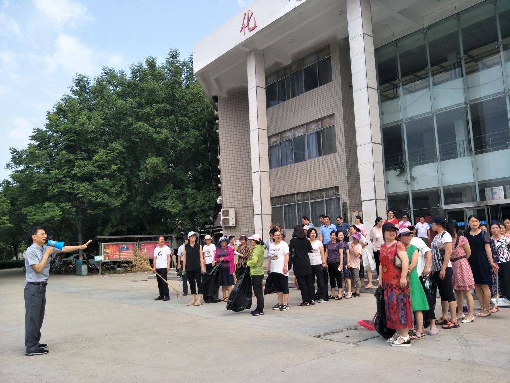 部分教职工在院大厅集合。经过简明扼要的动员演讲,义务劳动有条不紊的展开了。教职工被分为四队,一队负责整理化工院六楼楼顶废弃物,还有一队则用扫帚清扫化工院门口至中州路的道路及空闲地带,另外两队则分别清除学院附近树丛、花坛的垃圾杂物,清理枯枝杂叶等。