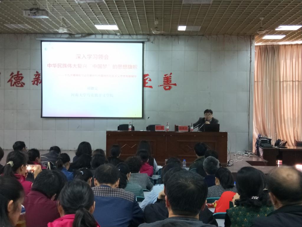 本次报告会由特邀嘉宾马克思主义学院刘德定教授主讲。刘德定以“深入学习领会中华民族伟大复兴的中国梦”为课题,从发展历程、基本内涵和目标、重大意义、精神实质以及实践要求,五个方面对中国梦进行了深入浅出的阐释。刘德定教授的报告内容详实、思路清晰,经典故事以及生活实例的引用增强了报告的趣味性,引起了观众的阵阵掌声。刘德定指出:中国梦具有中国特色、时代烙印,需要全体人民的共同参与。在实现中国梦的道路上,机遇与挑战并存,我国要破解发展面临的困境,引领健康持续发展。