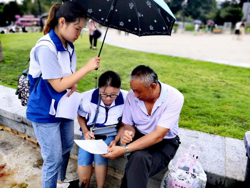 7月11日,实践队按照计划赶往西湖银滩公园,路途中突遇大雨,但到达银滩公园时大雨恰好停止且公园中游客众多,队员们趁着雨水暂停紧锣密鼓地展开工作。