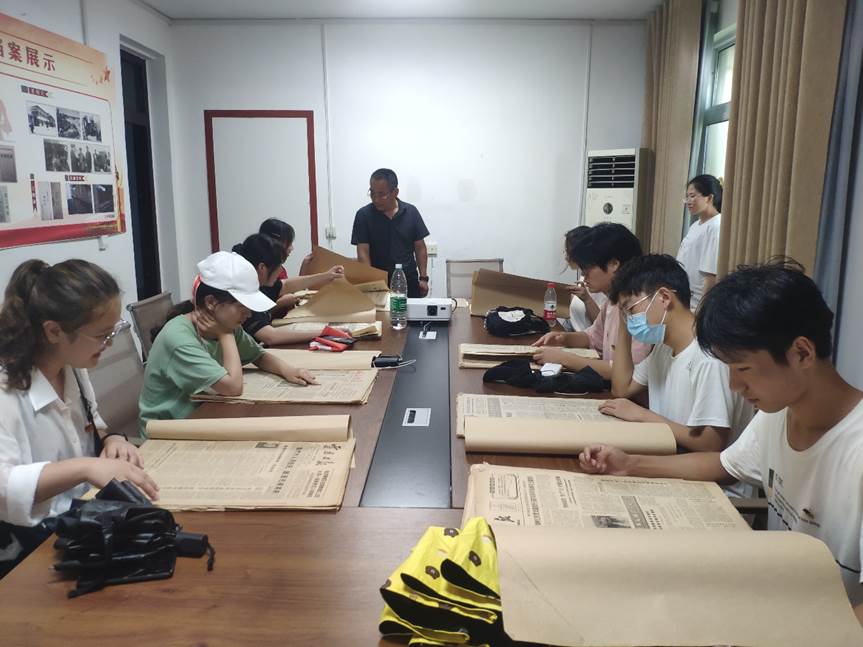 7月27日下午,实践团赶往兰考县档案局。在档案局工作人员的安排下,实践团有幸得以翻阅当年有关焦裕禄同志的新闻报刊。刊物档案摆放整齐有序,尽管纸张已经泛黄,但图片字迹清晰,内容完整。成员们浏览了上世纪六十年代及九十年代关于纪念焦裕禄书记的部分报纸,真切感受到焦裕禄防治“三害”不仅给兰考县带来了希望,也影响了周围的贫困县,更给全国人民树立了一个榜样。