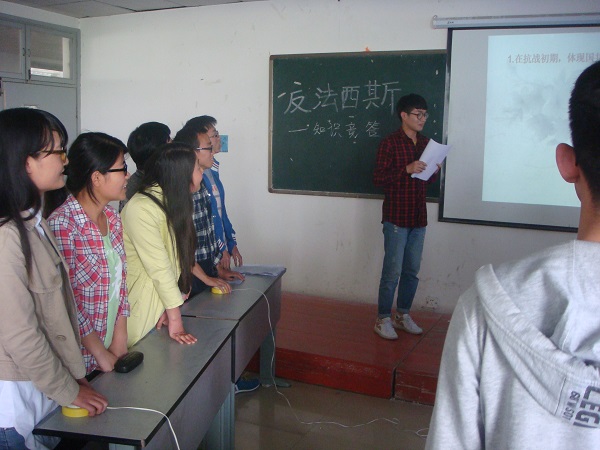 本次比赛分竞答和对答两个环节进行,新颖的竞赛方式激发了参赛者的激情和观众的热情。竞答阶段,比赛采取抢答的形式,为了增加本队的得分几率,每一位参赛选手都聚精会神,目不转睛的盯着自己的按钮,只待主持人的答题号令发出。期间,参赛选手的紧张专注,观众的饱满热情,使比赛更显妙趣横生。对答阶段,比赛采取高分队伍给低分队伍挑题的方式进行,题目包括单选、多选、填空。用多样的答题模式来考察选手们对反法西斯历史的认知,不仅增加了比赛的趣味性,更彰显了色中色