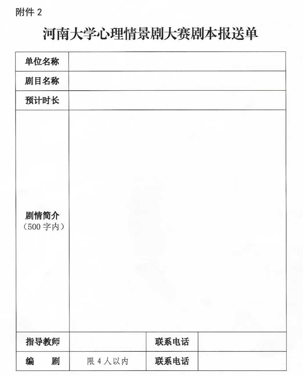 心理情景剧大赛剧本报送单》(附件2)及1部参赛作品剧本(.doc格式,以“负责人姓名+剧本名称”格式命名)汇总至一个文件夹,文件夹及邮件主题以“负责人姓名+心理剧参赛”格式命名,压缩发送至邮箱:[email protected]。
