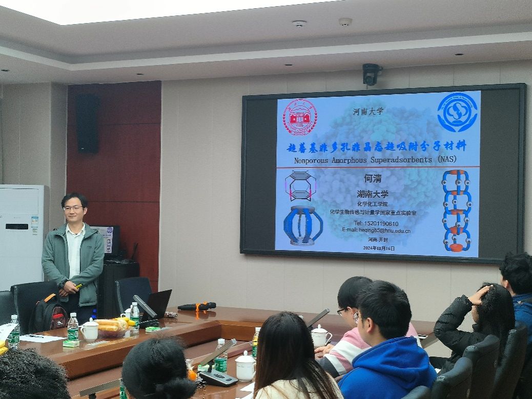 邀请,湖南大学何清教授在220会议室进行了一场题为“超蕃基非多孔非晶态超吸附分子材料”的学术报告。本次报告由执行院长徐元清主持。