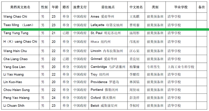 自1914年底开始,旧金山移民部门不再使用华人乘客名单,这对今天的研究者来说,意味着其中的“中文签名”红利业已告磬。前3批和1913年、1914年的庚款留美学生的身份鉴定都得益于此,参见,比如(2)。1918年这批学生的身份确认就没有那么直截了当了,必须求助于中文资料。本文用到的主要参考资料,一是谭清华的《清华学校毕业生考(上):1912-1919级 》(下称谭文)(3),文中有1912——1919年间每年清华学校毕业生名字和生平简介;二是王晓慧的《全球史视野下的清华专科女生留美教育述略》(下称王文)(4)中有1914-1927年间清华学校历年考选庚款留学的全部53位专科女生的名录;台湾学者房兆楹编写的资料集《清末民初洋学学生题名录初輯》(5)中之“清华学校同学录”等也是重要资料。最终,这批庚款留美学生的中文姓名都已找到。