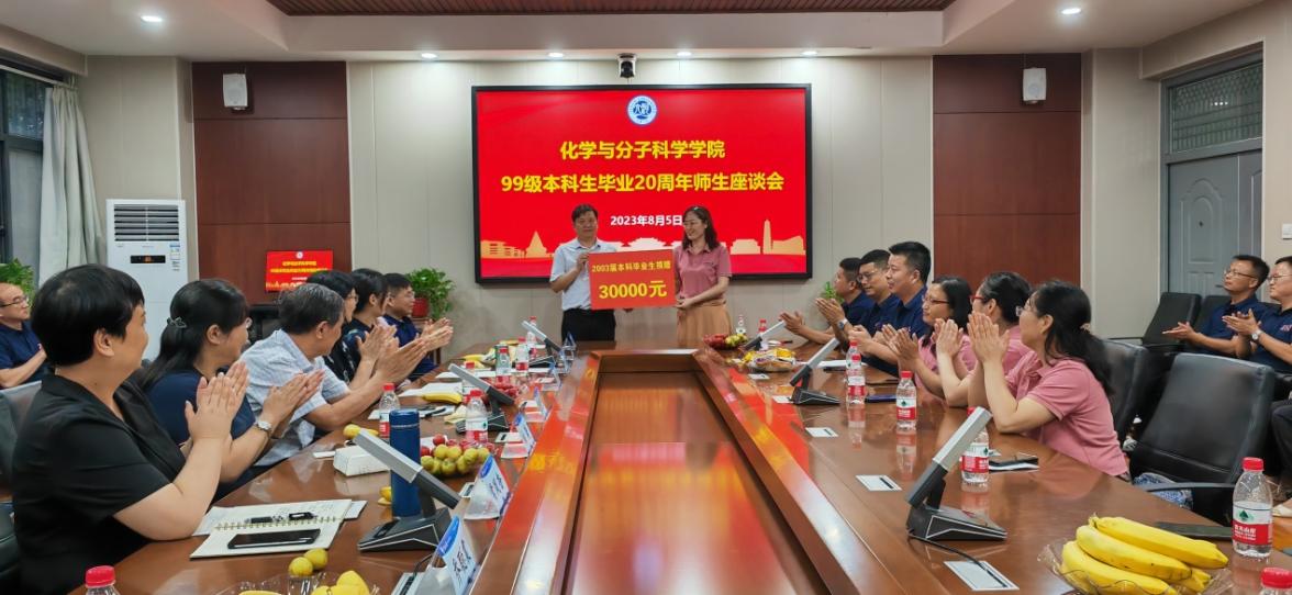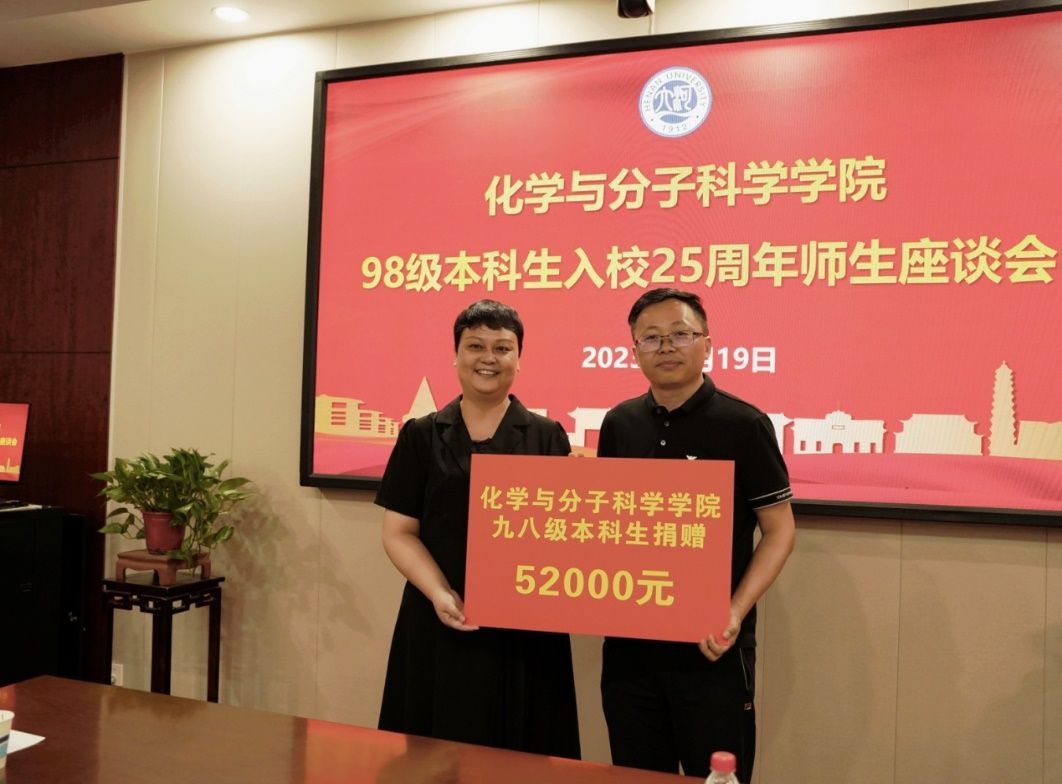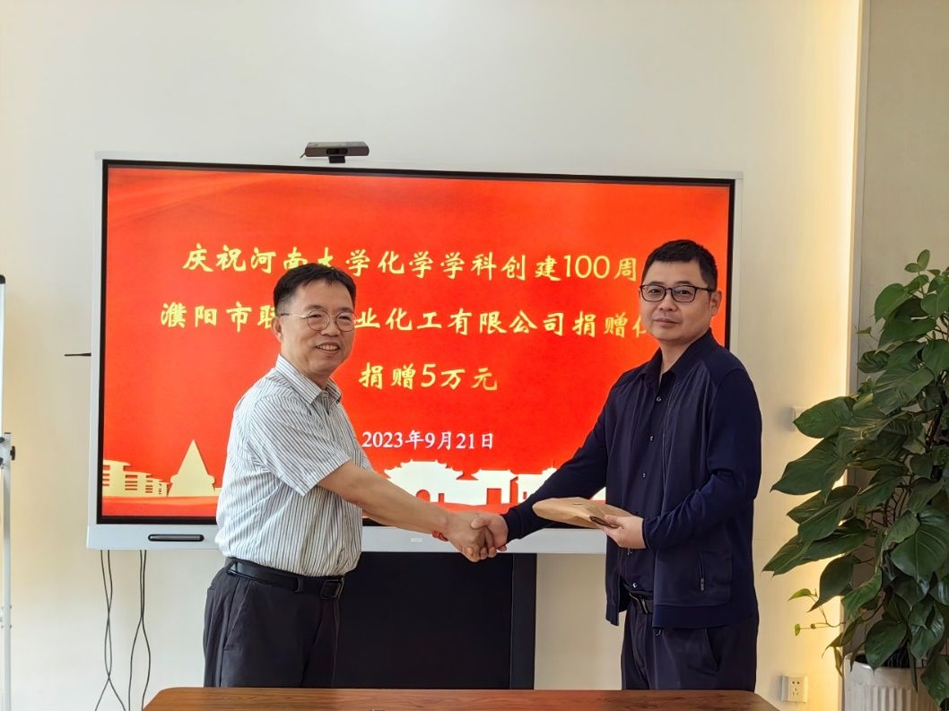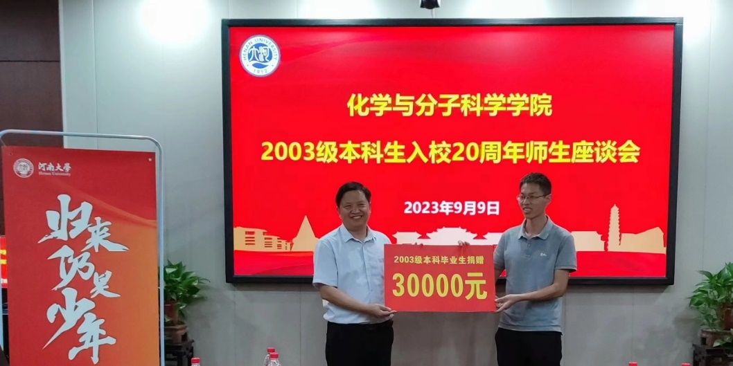 教育基金》《化学学科百年庆典基金》,校友任职的河南中镜科仪科技有限公司、河大纳米材料工程研究中心有限公司、濮阳市联众兴业化工有限公司等企业,1993届、2002届、2002届、2003届、2007届和2013届秩年返校年级,薛冬峰、李鑫恒、孙会靓、赵俊东等校友,共计为化学学科捐赠50余万元,助力学科和学院人才培养、文化建设和提升软硬件条件。