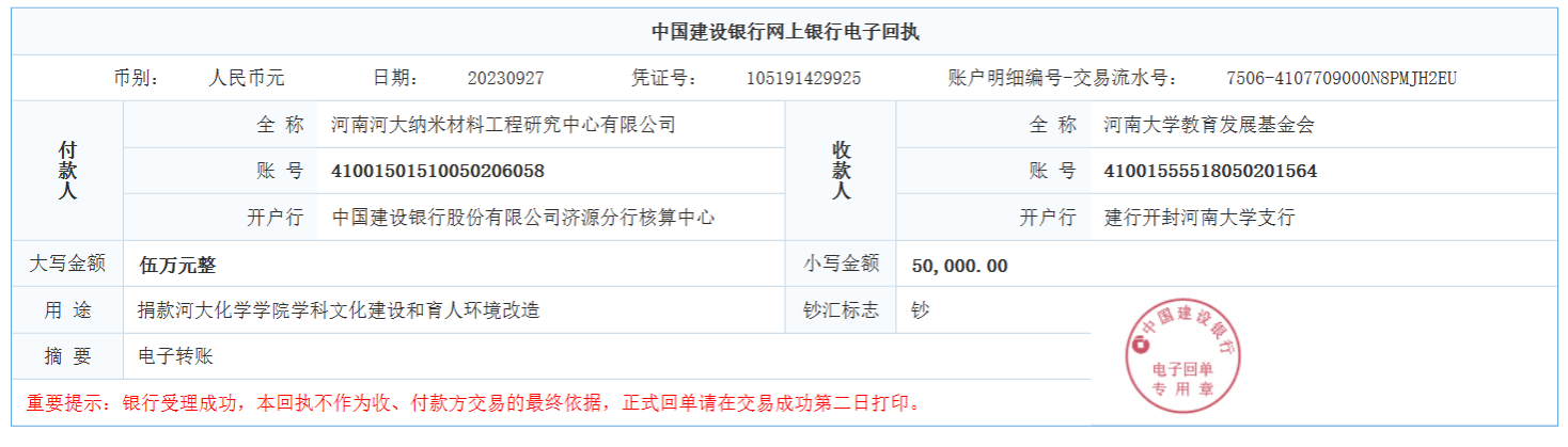 河南河大纳米材料工程研究中心有限公司捐赠五万元